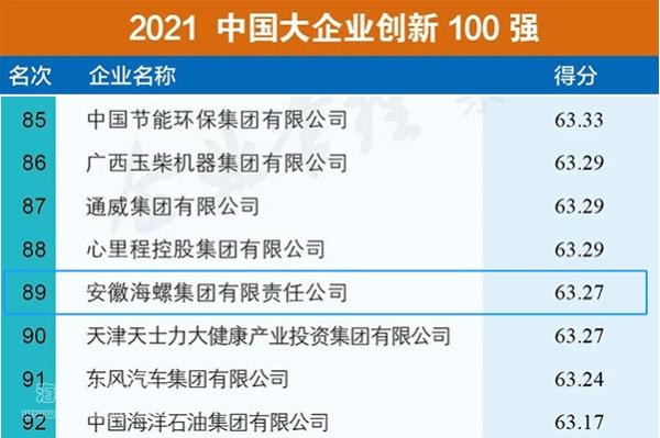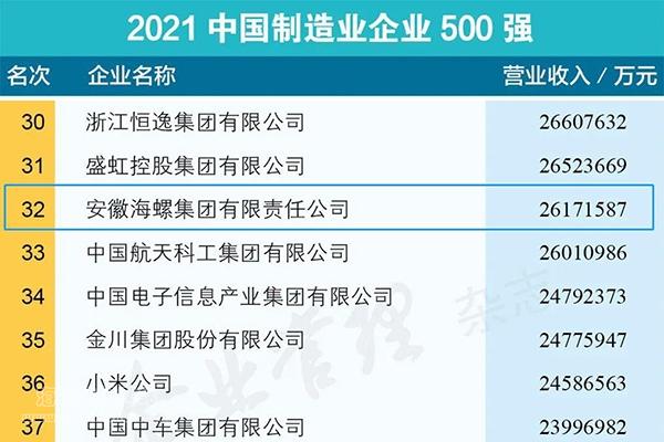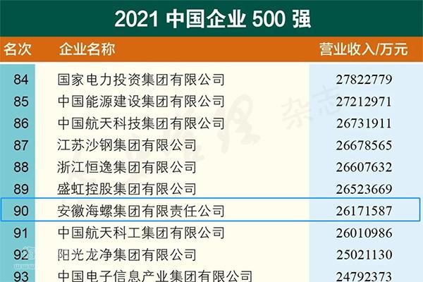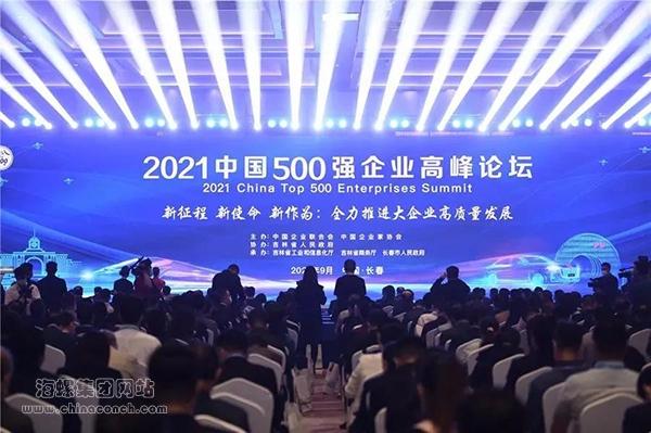 2021年9月24日—25日,2021中國企業500強高峰論壇在吉林長春舉行,向社會發布了“中國企業500強”榜單。海螺集團連續17年入圍中國企業500強,榮列2021中國企業500強第90位,較2020年上升了2位;同時,榮列2021中國制造業企業500強第32位;榮列2021中國跨國公司100大第89位,比2020年上升7位;首次登上中國2021大企業創新100強榜單,名列第89位。