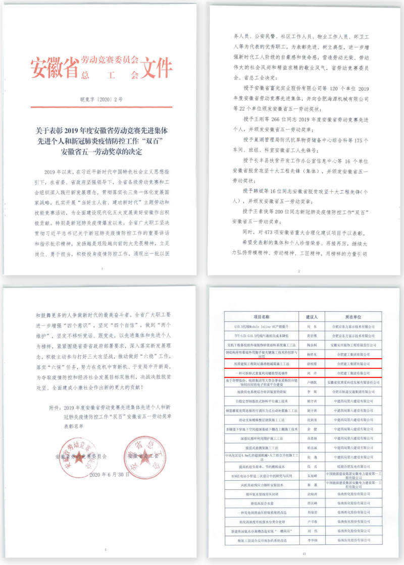 近日,由安徽省勞動(dòng)競(jìng)賽委員會(huì)、安徽省總工會(huì)組織評(píng)選的2019年安徽省重大合理化建議項(xiàng)目獎(jiǎng)揭曉,安徽國貿(mào)集團(tuán)所屬合肥建工公司首次申報(bào)的《鋼結(jié)構(gòu)異形幕墻外用腳手架關(guān)鍵施工技術(shù)的創(chuàng)新與應(yīng)用》(楊皓東)、《房屋建筑工程阻尼器消能減震施工工法》(涂剛要)和《一種可拆卸式重復(fù)利用螺栓型連墻件》(劉洋)均榜上有名。
